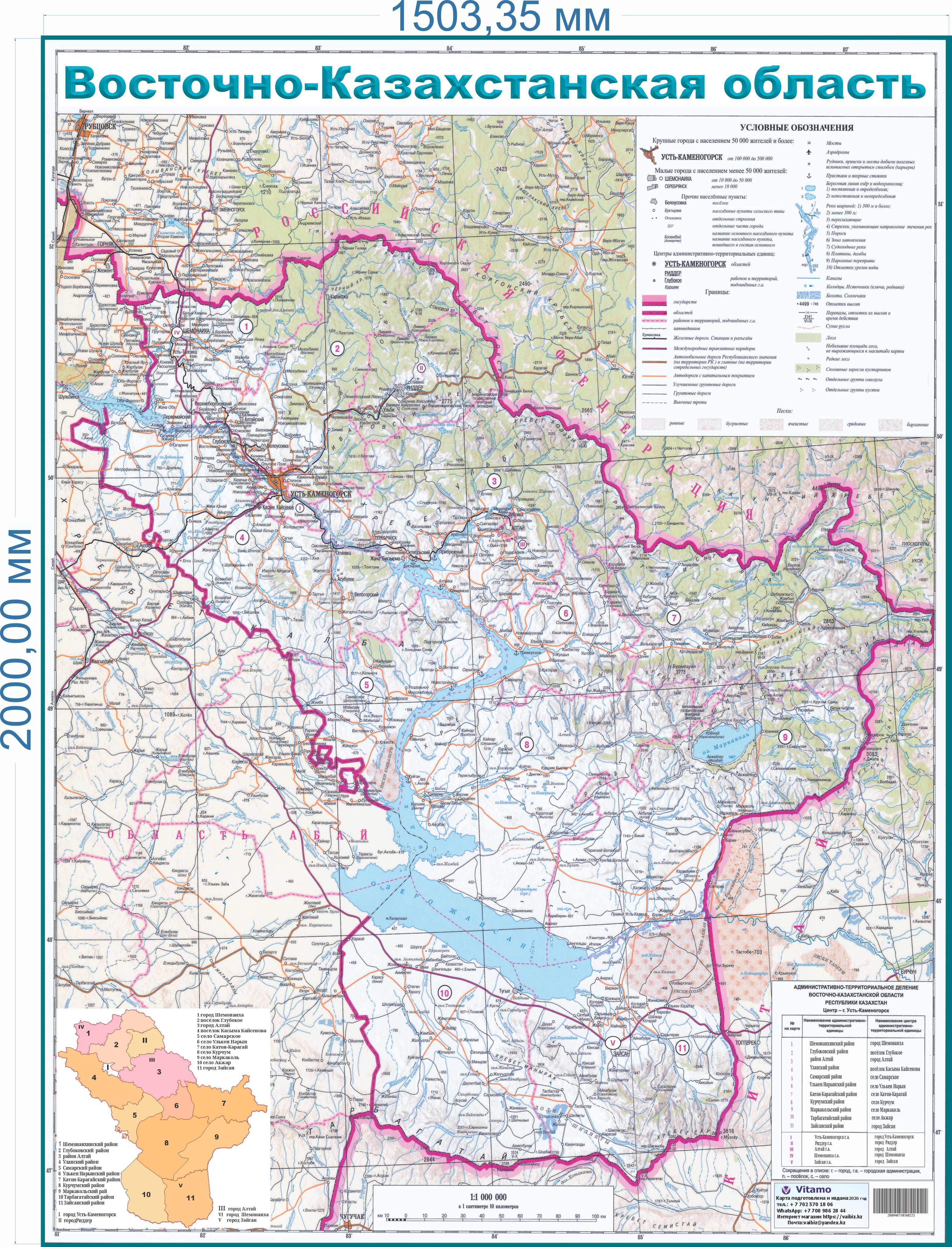 Эта карта станет незаменимым помощником как дома, так и в офисах компаний, стремящихся акцентировать внимание на региональной принадлежности. Изготовленная из качественных материалов, она обеспечит долговечность и сохранение яркости красок. В сочетании с профессиональной упаковкой доставка осуществляется быстро!Большая настенная карта Восточно-Казахстанской области 2026 года (формат 150x200 см) от производителя Vaibiz, Казахстан – идеальный способ подчеркнуть уникальность интерьера и всегда иметь под рукой точное изображение региона. Подробная визуализация местности поможет вам лучше ориентироваться и вдохновит на новые открытия!