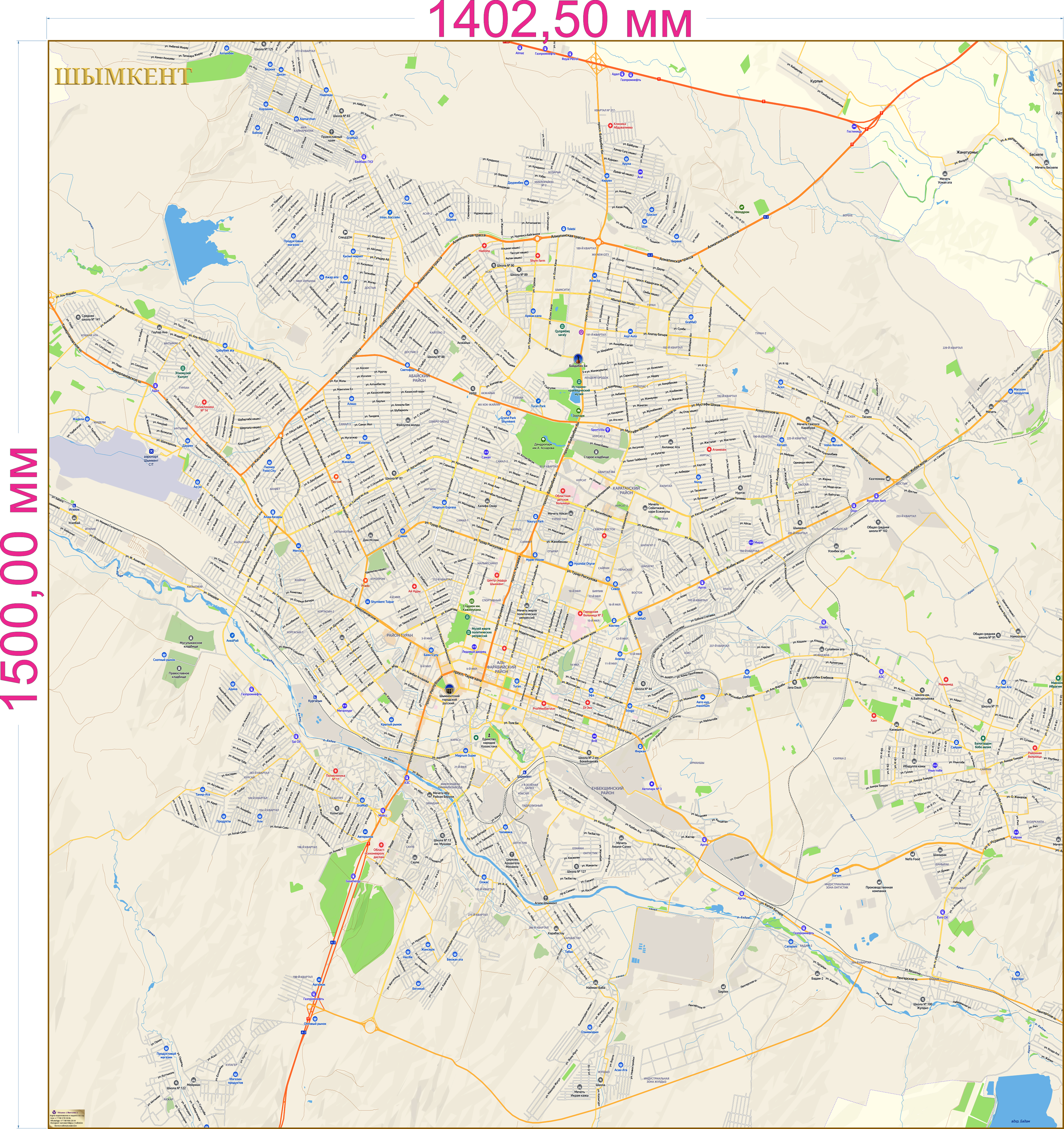 Современная план-схема города Шымкент 2026 года от производителя Vaibiz (Казахстан) – идеальный помощник для жителей и гостей города! Размер 150х140 см позволяет детально рассмотреть улицы, районы и инфраструктуру. Удобно размещается на стене, предоставляя быстрый доступ к информации о маршрутах и расположении объектов!